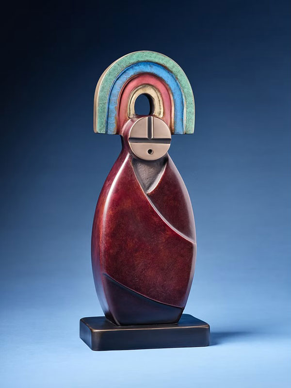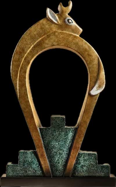 My contemporary sculptures draw inspiration from the aesthetic motifs found in the ceremonial regalia and dances of my Native American heritage (Santa Clara Pueblo and White Mountain Apache). My works include representations of Apache crown dancers, Pueblo corn, deer, elk, antelope, buffalo dancers, pan-American Matachines, as well as “essentialized” Native American medicine bears and various sacred animals. I use stone stone exclusively for my work, including both exotic and domestic marble, limestone, alabaster, and onyx. Some one-of-a-kind stone originals are then chosen to be cast in bronze in limited editions, featuring patinas in a variety of colors, patterns, and textures.